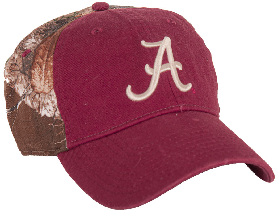 3D ivory Script A embroidered on an unstructured cap. Crimson eyelets on the Max Camo complete the look.